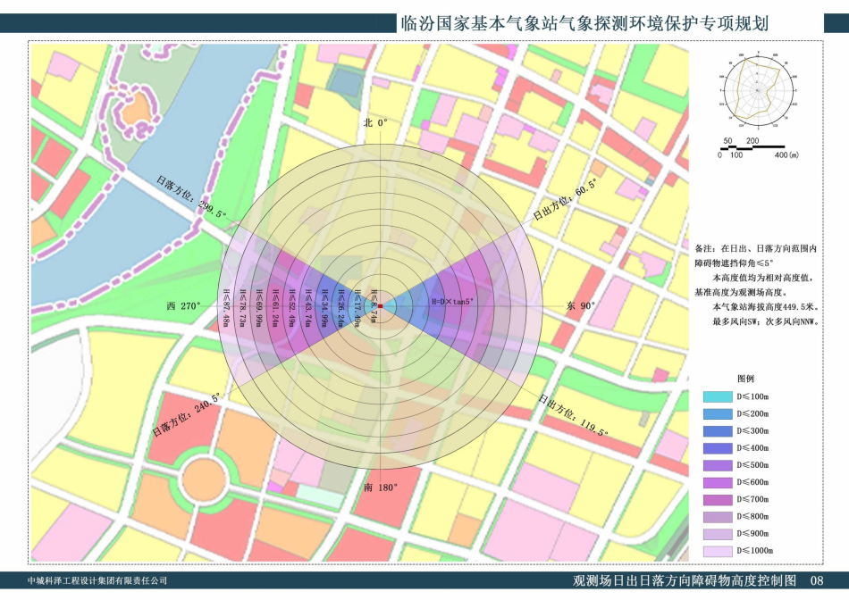 临汾国家基本气象站在日出方向(60.5°—119.5°)和日落方向(240.5°—299.5°)内(此方向内不受控制区限制),障碍物遮挡仰角不大于5度,即障碍物最高点相对高度:H≤D×tan5°(本高度值均为相对高度值,基准高度为观测场高度)。其中H代表日出日落方向的相对高度,D代表障碍物高出观测场平面以上部分的高度与该高点在观测场地平面的投影点至观测场围栏最近点之间的距离。